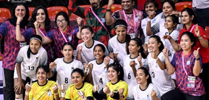 স্পোর্ট ডেস্ক: থাইল্যান্ডের ব্যাংককে লিগ পর্বের শেষ ম্যাচে মালদ্বীপকে ১৪–২ গোলে উড়িয়ে দিয়ে ইতিহাস গড়েছে বাংলাদেশ। এই বিশাল জয়ের মধ্য দিয়ে অপরাজিত চ্যাম্পিয়ন হয়ে প্রথমবারের মতো সাফ উইমেন’স ফুটসাল চ্যাম্পিয়নশিপের শিরোপা জয় করল বাংলাদেশের নারী দল। এই জয়ে ছয় ম্যাচে পাঁচটি জয় ও একটি ড্র নিয়ে মোট ১৬ পয়েন্ট অর্জন করে পয়েন্ট টেবিলের শীর্ষে থেকে শিরোপা নিশ্চিত করে বাংলাদেশ। অন্যদিকে টানা পাঁচ ম্যাচ হেরে মালদ্বীপ পয়েন্টের খাতা খুলতেই পারেনি। ম্যাচের শুরুতে অবশ্য চমক দেয় মালদ্বীপ। ম্যাচের চতুর্থ মিনিটে সানিয়া ইব্রাহিমের গোলে তারা ১–০ ব্যবধানে এগিয়ে যায়। তবে এই লিড বেশিক্ষণ স্থায়ী হয়নি। দুর্দান্ত এক ফ্রি কিক থেকে সাবিনা খাতুন সমতা ফেরান। এরপর আরেকটি ফ্রি কিক থেকেই তিনি ব্যবধান বাড়ান। প্রথমার্ধের শেষভাগে পুরোপুরি আধিপত্য বিস্তার করে বাংলাদেশ। কৃষ্ণা রানী সরকার, লিপি আক্তার, নিলুফা আক্তার নীলা ও রওশন জাহানের গোলে বিরতিতে যাওয়ার আগে স্কোরলাইন দাঁড়ায় ৬–১। দ্বিতীয়ার্ধে বাংলাদেশের গোলবন্যা আরও তীব্র হয়। সাবিনা খাতুন পূরণ করেন নিজের হ্যাটট্রিক। এরপর মাতসুশিমা সুমাইয়া, নিলুফা আক্তার, লিপি আক্তার (হ্যাটট্রিক), কৃষ্ণা রানী সরকার, মেহেরুন ও মাসুরা পারভীনের গোলে ব্যবধান বেড়ে দাঁড়ায় ১৪–১। ম্যাচের শেষ দিকে মালদ্বীপের মারিয়া একটি গোল শোধ দিলেও বড় ব্যবধানের হার এড়াতে পারেনি। সাবিনা ও লিপির হ্যাটট্রিকের পাশাপাশি কৃষ্ণা, নীলা, মাসুরাসহ একাধিক খেলোয়াড়ের গোলের নৈপুণ্যে স্মরণীয় এই জয় পায় বাংলাদেশ। এর মাধ্যমে ফুটসালে নতুন ইতিহাস রচনা করে প্রথম সাফ নারী ফুটসাল চ্যাম্পিয়নশিপের ট্রফি ঘরে তোলে বাংলাদেশের মেয়েরা।